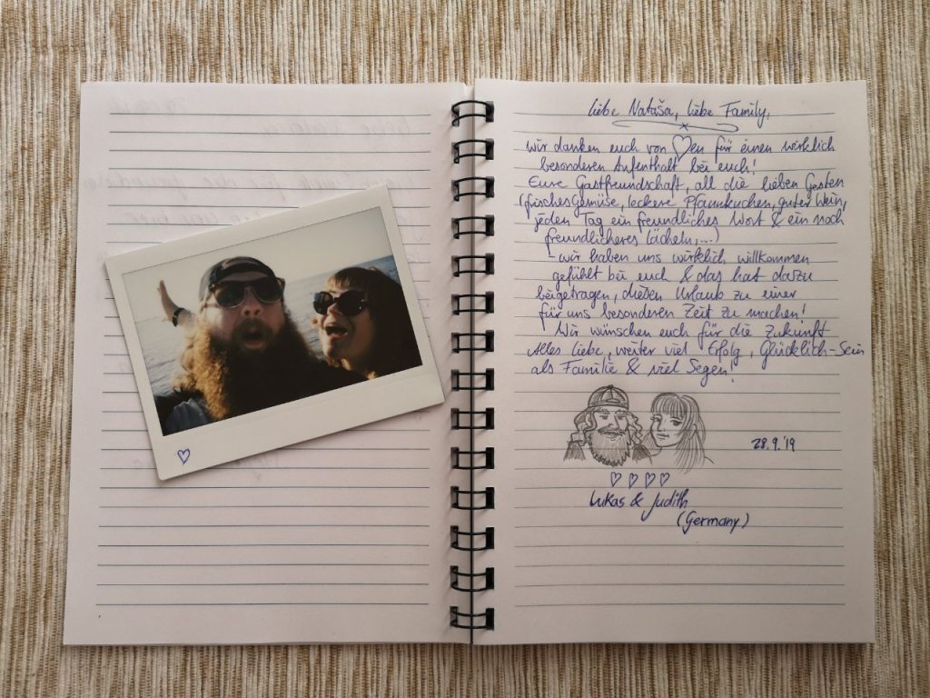 “Liebe Nataša, liebe Family, Wir danken euch von Herzen füer einen wirklich besonderen Aufenthalt bei euch. Euere Gastfreundschaft, all die lieben Gesten (frisches Gemüse, leckere Pfankuchen, guter Wein, jeden Tag ein freundliches Wort & noch freundlicheres Lächern….). Wir haben uns wirklich willkommen gefühlt bei euch & das has dazu beigetragen, diesem Uralub zu einer für uns besonderen Zeit zu machen! Wir wünschen euch für die Zukunft alles liebe, weiter viel Erfolg, Glücklich-Sein als Familie & viel Segen!”