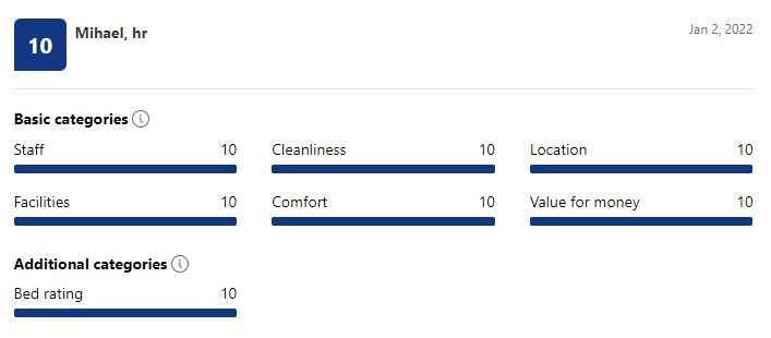 “Oli aivan ihana yllätys kun saavuimme paikalle, että jääkaapissa odotti ruokatarvikkeita,pöydällä oli tuoreita hedelmiä. Ja Natasa oli aivan ihanan ystävällinen,huolehti että meillä on kaikki hyvin. Ja lähtöpäivänä saimme vielä läksiäislahjan josta tuli hyvä mieli. Paikka oli siisti ja puhdas, kaikki toimi hyvin. Erittäin rauhallinen paikka. Omalla autolla liikkuminen oli erittäin helppoa. Iso suositus.“